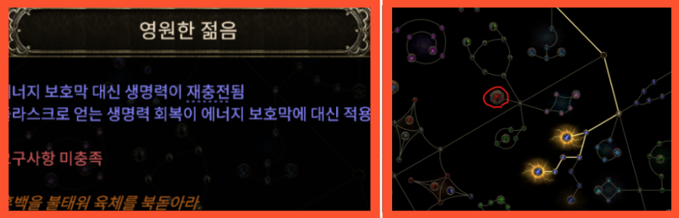 💡 저는 '영원한 젊음'을 찍지 않는 빌드로 진행했지만, 후반부 생존력 상황에 따라 패시브 트리를 변경할 수도 있어요.